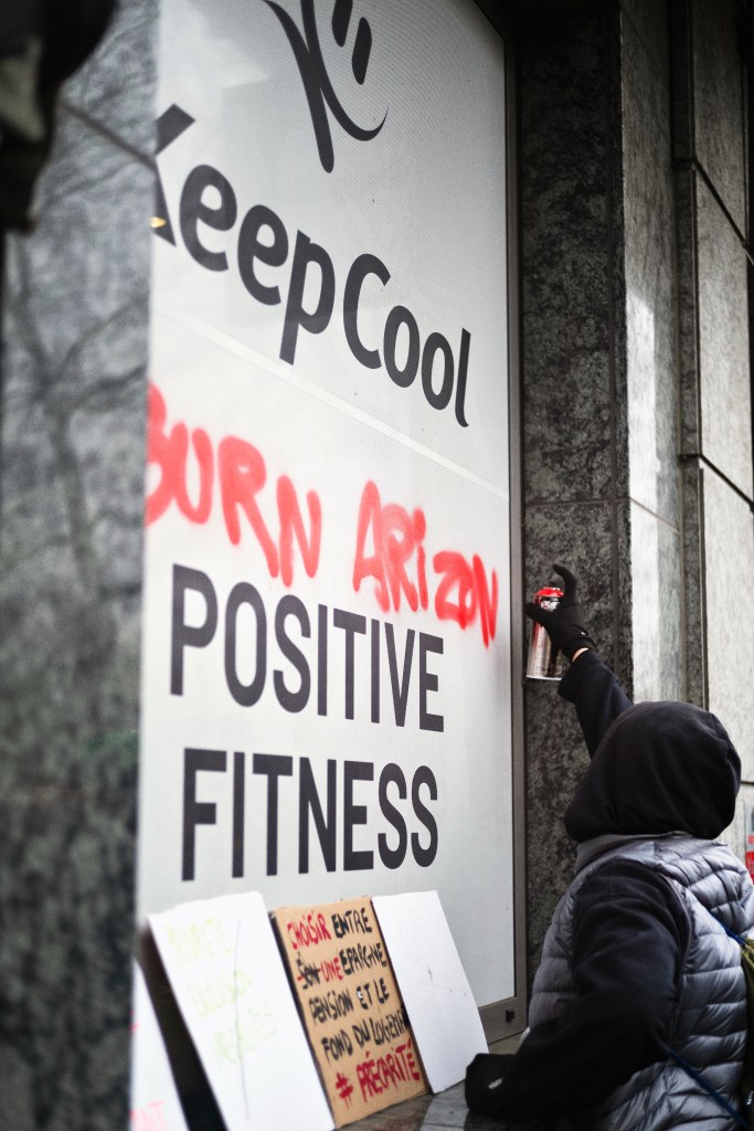 Les forces de l’ordre ont également gazé et chargé des militaires au niveau de la place Louise et à Arts-Loi. Plusieurs interpellations ont eu lieu, dont celles de manifestant·e·s en possession de projectiles ou de pétards. Par ailleurs, de nombreux tags et d’autres dégradations ont eu lieu tout au long du chemin, notamment à la Toison d’Or, où des vitrines ont été brisées. Plusieurs enseignes ont été visées, dont le Carrefour situé devant le métro Arts-Loi, qui a été la cible de jets de projectiles, de vitres brisées, et de nombreux tags, dont un « Boycott Carrefour » en référence à la lutte de soutien à la Palestine.