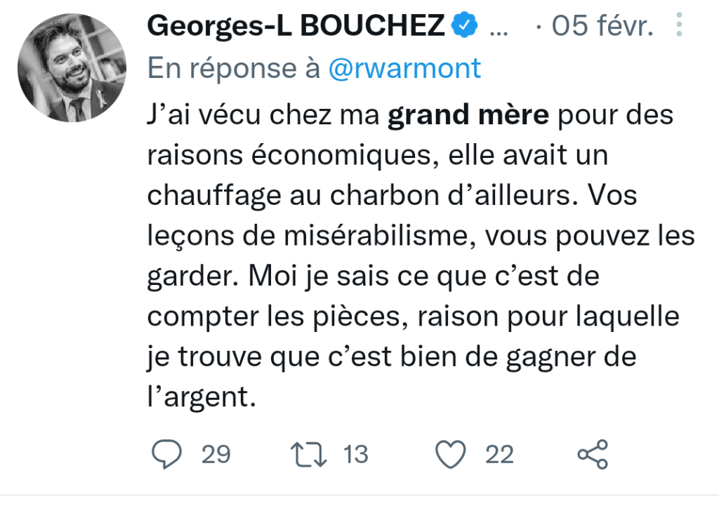 (Par ailleurs, Bouchez n’hésite pas à magner l’art du mensonge, comme de nombreux.ses dangereux.ses politicien.ne.s à l’heure actuelle. Dans un tweet du 5 février, il expliquait avoir vécu chez sa grand-mère pour des raisons économiques et ne pas avoir besoin de leçon de misérabilisme. Le 14 mai, il déclarait pourtant « je n’ai pas connu mes grands-parents » à Sudinfo [1].)