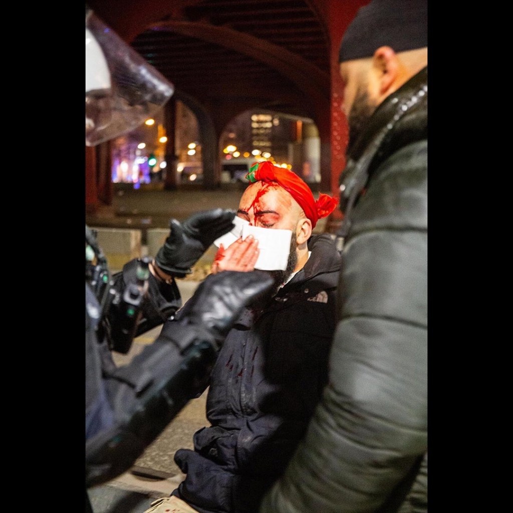 La police a encerclé les support·rice·s sans disctinction, prenant dans la nasse toutes les personnes qui étaient rassemblées sur le bd. Lemonnier. A la suite de cette nasse, nous avons constaté plusieurs personnes en sang ayant subies des violences policières, parmi lesquelles un blessé menottée au sol sur le ventre sans assistance médicale. Une vidéo atteste notamment d’un homme d’une quarantaine d’années, crâne ouvert, qui explique s’être fait matraquer sans raison. Malgré l’interpellation des policier·ère·s par des personnes autour de la nasse, l’ambulance est arrivée seulement plusieurs dizaines de minutes après, la police empêchant une prise en charge plus rapide.