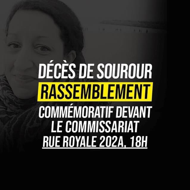 Sourour est décédée en cellule ce jeudi 12 janvier. Le @mouvement.pac (l’association où elle travaillait) appelle à un rassemblement de deuil à 18h ce dimanche soir, devant le commissariat en question (Rue Royale 202A). L’association commente « Nous sommes au plus près de ses proches dans la recherche nécessaire et légitime d’informations claires sur les circonstances de son décès. La lumière devra être faite sur les évènements qui ont précédé le drame et sur le degré de responsabilité des autorités de police » (1).