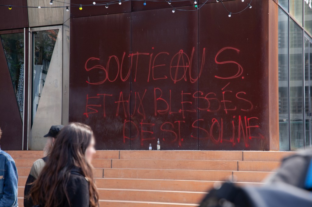 Des tags ont fleuri le long du parcours, un arrêt et une banderole ont été posés lorsque la manifestation est passée devant l’occupation de l’Hospitalière, un grand squat de sans-papiers. En plus de tags sur le palais de justice, une banderole justice pour Sourour a été déployée dans la rue des Tanneurs. Des messages de soutien à la France, aux blessé.es du mouvement des retraites, de Sainte-Soline ainsi qu’à Serge, ont été aperçus sur le trajet.