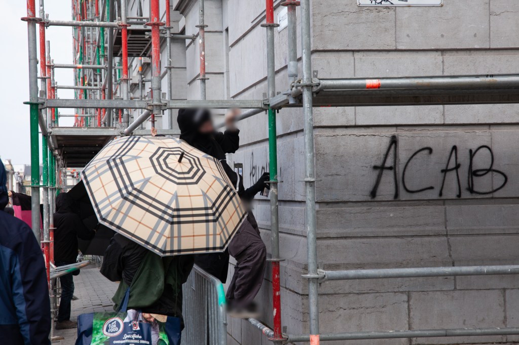 En début de manifestation, sur l’avenue Henri Jaspar, des manifestant·es ont endommagé la façade de laChambre nationale des huissiers de justice. Un tag a été écrit devant le bâtiment, en solidarité avec les grévistes de chez Delhaize, qui rentrent maintenant dans leur 8e semaine de lutte contre la franchisation de plus de 120 grands supermarchés. A plusieurs reprises, des huissiers ont été appelés à lever leurs piquets de grève sous peine d’amendes colossales, l’action semble donc avoir été menée en réaction. Depuis le 3 mai une décision de justice a par ailleurs interdit les piquets de grève sur l’ensemble des magasins.