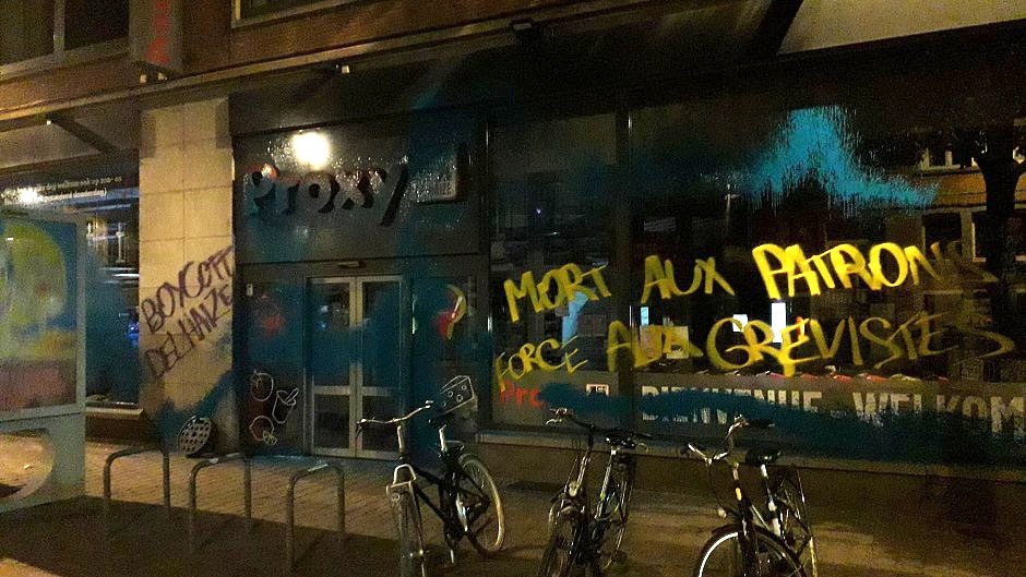 En 5 mois, ce sont des dizaines de blocages et de rassemblements devant les enseignes de la marque qui ont été organisés par les travailleur·ses et leurs soutiens, ainsi que des grandes manifestations syndicales rassemblant des milliers de personnes et une série d’actions offensives contre l’entreprise. Les magasins ont été systématiquement recouverts d’affiches, taggués, dégradés et, parfois, les infrastructures ont été sabotées. La maison du CEO de Delhaize a même récemment été aspergée de peinture.