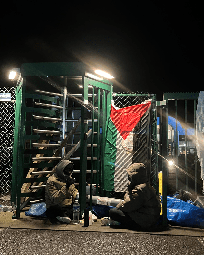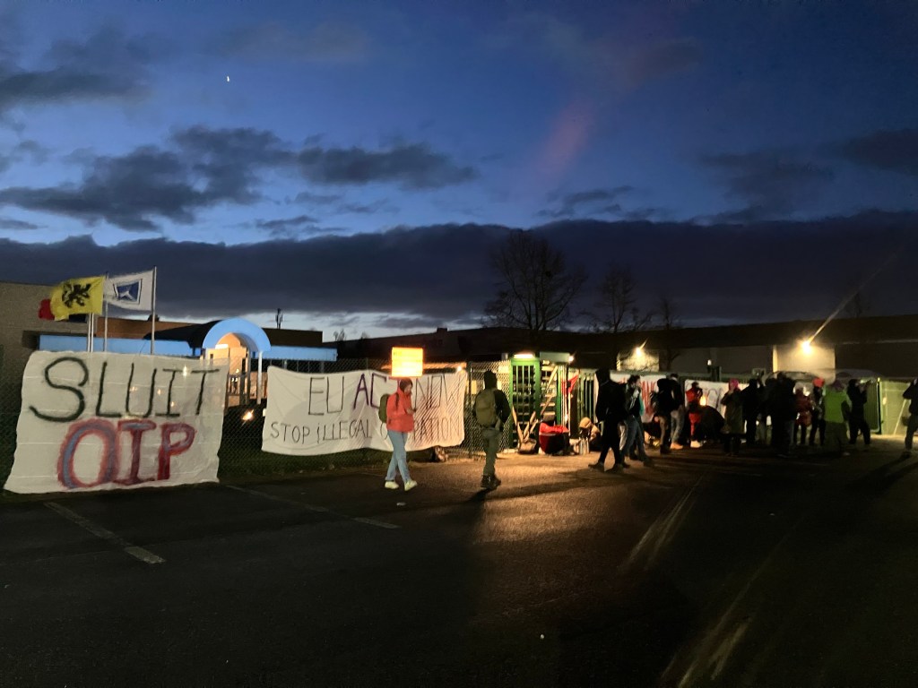 Les entrées du site ont été bloquées à l’aide arm lock. Sur des banderoles on peut lire « Sluit OIP », « Stop génocide », « EU act now stop illégal occupation ». La police vient d’arriver sur place. Des négociations sont en cours.