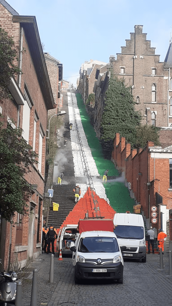 Dans la nuit du 17 au 18 mars, les escaliers emblématiques de Bueren à Liège, longs de 374 marches, ont été repeints par des militant•es en soutien à la Palestine. Cette action s’inscrit dans une série d’autres actions où des escaliers avaient été repeints à Bruxelles, Paris, Marseille, Nantes et Lyon.