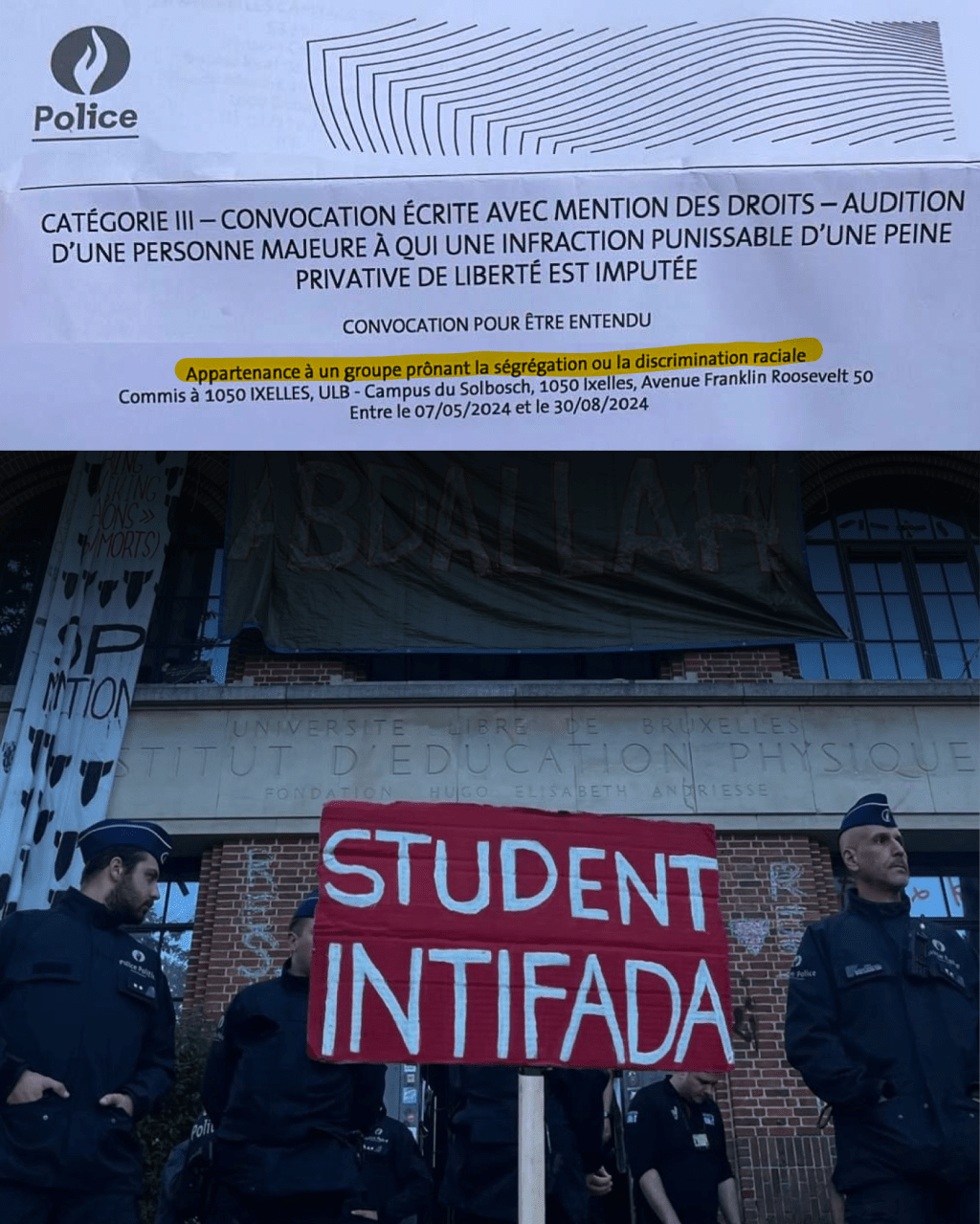 Depuis le 30 août 2024, deux mois après l’expulsion du bâtiment « Walid Daqqa » de l’Université Libre de Bruxelles (ULB), près de 30 personnes (étudiantes et non-étudiantes) ont reçu dans leur boite aux lettres ou en main propre une convocation pour comparaître devant la police. Le principal chef d’inculpation ? « Appartenance à un groupe prônant la ségrégation ou la discrimination raciale », dans le cadre du mouvement étudiant, probablement suite aux plaintes déposées par les autorités de l’ULB. Les forces de l’ordre semblent essayer de criminaliser le mouvement de soutien à la Palestine en l’accusant d’antisémitisme.