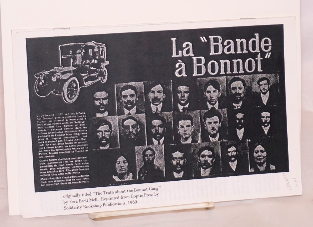 *La bande à Bonnot était un groupe anarchiste français qui opéra en France et en Belgique de 1911 à 1912. Du nom d’un de ses membres les plus connus, cette bande s’est fait connaître pour ses braquages et ses exécutions spectaculaires. Elle suscita la peur au sein de la bourgeoisie et fut traquée par la police et la presse.