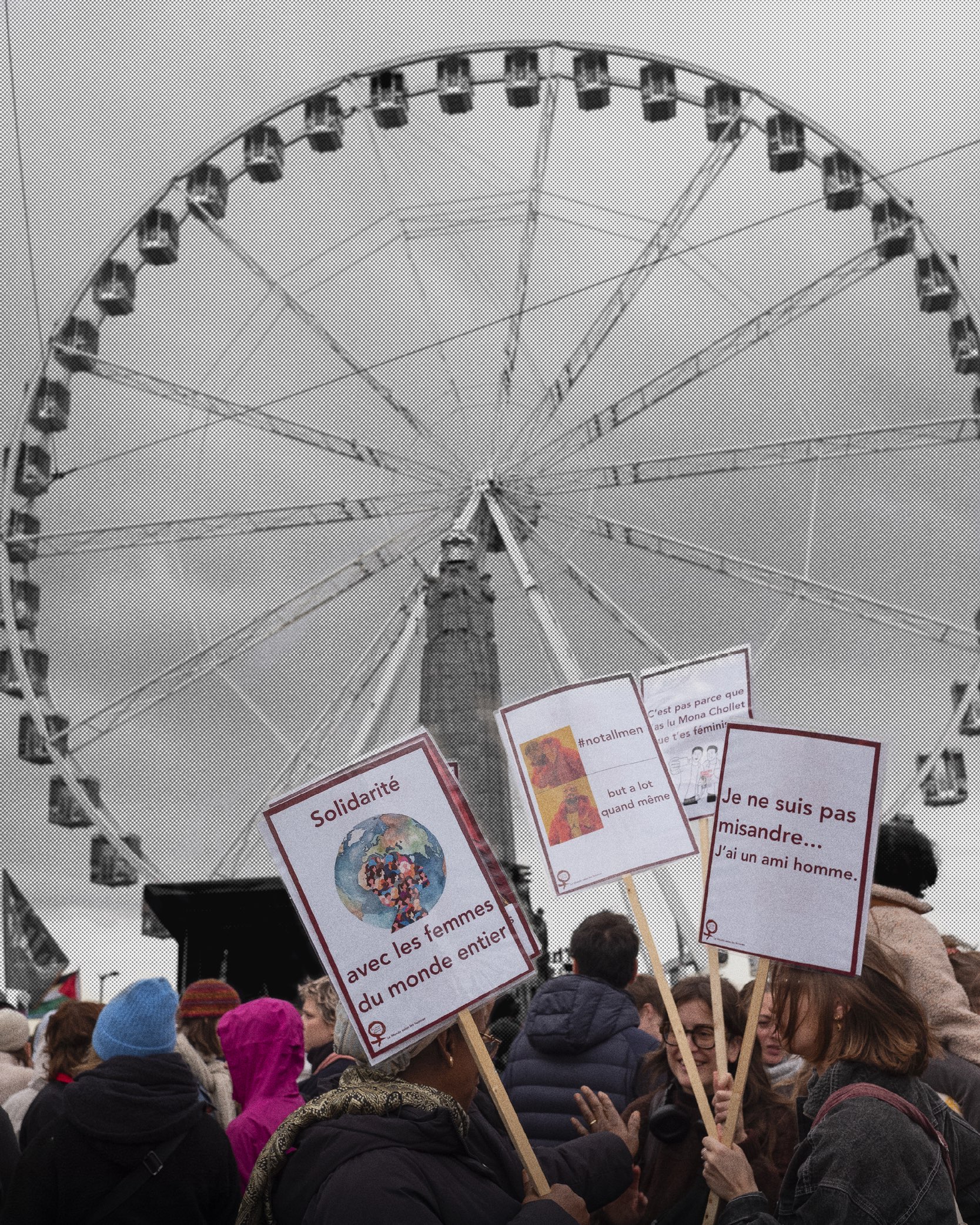 Parmi l’éventail politique présent, notons la présence d’une partie du monde associatif et militant, de syndicats et de partis politiques. Un bloc de femmes iraniennes, kurdes et turques était aussi présent. Comme lors du dernier 8 mars, l’accent à une nouvelle fois été mis au soutien du peuple palestinien. Des femmes palestiniennes ont pris la parole au début du rassemblement et de nombreux drapeaux étaient visibles pendant l’entièreté de la manifestation. Pour rappel, les femmes sont les premières victimes des conflits armés.