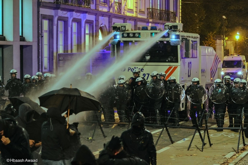 Les restrictions sur le droit de manifester constituent l’un des aspects les plus visibles de cette répression. De nombreuses manifestations en soutien à la Palestine ont été interdites ou violemment réprimées. En France, le ministre de l’Intérieur a ordonné des interdictions systématiques durant le mois d’octobre 2023, justifiées par une présumée menace pour la sécurité publique. À Bruxelles, des rassemblements pacifiques ont été dispersés par la police, qui a utilisé des gaz lacrymogènes et des canons à eau pour dissuader les manifestant·es.