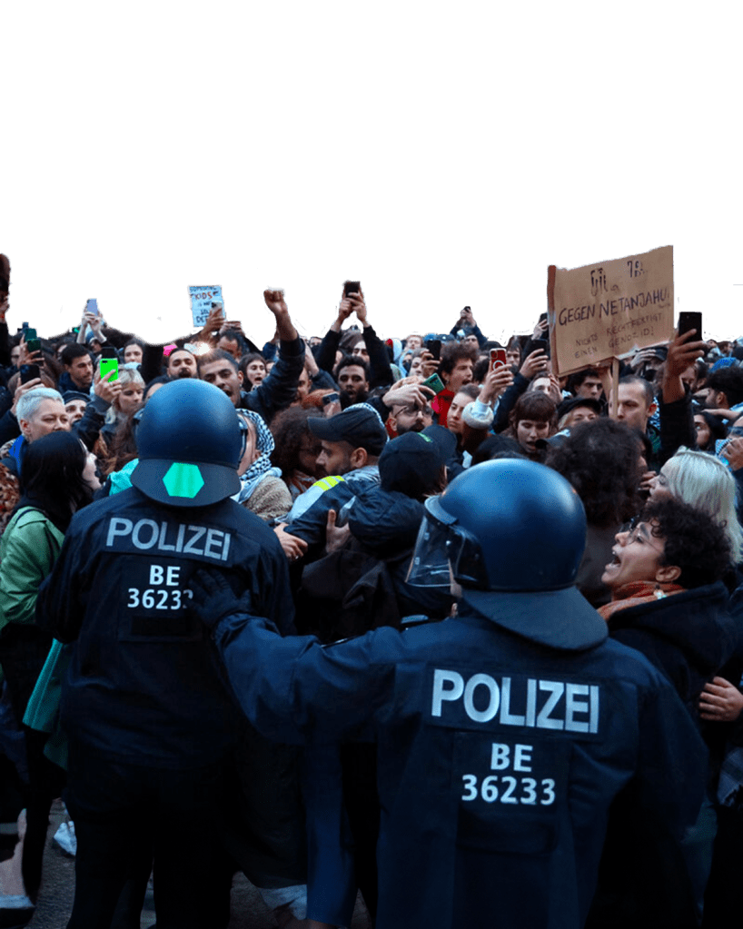 En Allemagne, des manifestations ont été interdites préventivement, et la police a souvent recouru à une force excessive pour disperser les rassemblements, même lorsqu’ils étaient pacifiques. La phrase « De la rivière à la mer, la Palestine sera libre », utilisée lors de certaines manifestations, est systématiquement et volontairement interprétée comme un appel à la violence, justifiant des interventions musclées.