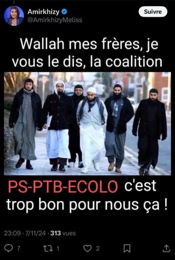 C’est notamment Melissa Chichebor Amirkhizy (Amirkhizy sur X, le réseau du milliardaire d’extrême droite Elon Musk), qui multiplie la publication de contenus racistes sur les réseaux. Cette dernière, est présidente de l’assemblée consultative du MR, elle a déjà été au coeur d’une polémique raciste et islamophobe pour avoir fait des tweets contre la coalition PS – PTB – Ecolo à Mons.