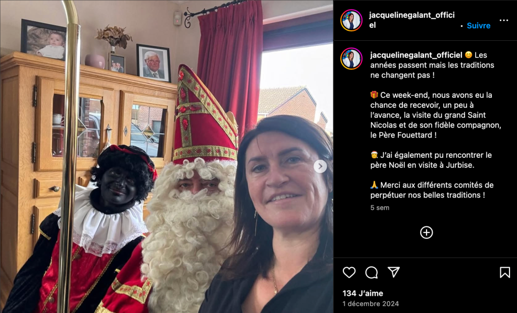 Là où, depuis plusieurs années les mouvements antiracistes ont clairement établi le caractère raciste et colonial de la blackface derrière le « Père Fouettard », Jacquelines indique par sa publication qu’elle, elle reste bien du côté de la tradition…