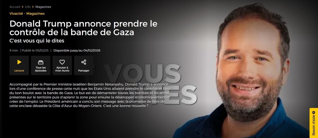 L’émission de micro-trottoir de la RTBF a ainsi interrogé ses auditeur·rices en présentant le projet de Trump comme une possibilité sérieuse, la décrivant comme telle : « Le but est de démanteler toutes les bombes et les armes présentes sur le territoire puis d’aplanir la zone pour ensuite la développer économiquement et créer de l’emploi. C’est une bonne nouvelle ? » Une question qui normalise un discours de colonisation forcée en omettant complètement la volonté et les droits des habitant·es de Gaza ainsi que le génocide en cours.