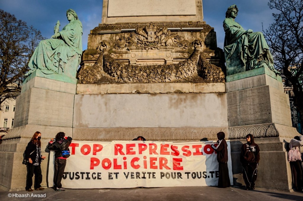 Au moment de lire son discours, la sœur de Imad – tué le 23 mars 2023 à Seneffe – expliquait : « La justice nous considère et nous traite comme des criminels, et les policiers comme des victimes. » « Le policier qui a tué mon frère est encore en service dans la région, je me sens plus chez moi, je suis hantée par la peur de me faire contrôler par ce policier, un jour de le croiser. ». La sœur de Imad a aussi rappelé à quel point les familles des victimes de violences policières se retrouvent confronter à des machines judiciaires bien rodées, qui visent à les épuiser, économiquement, moralement et socialement.