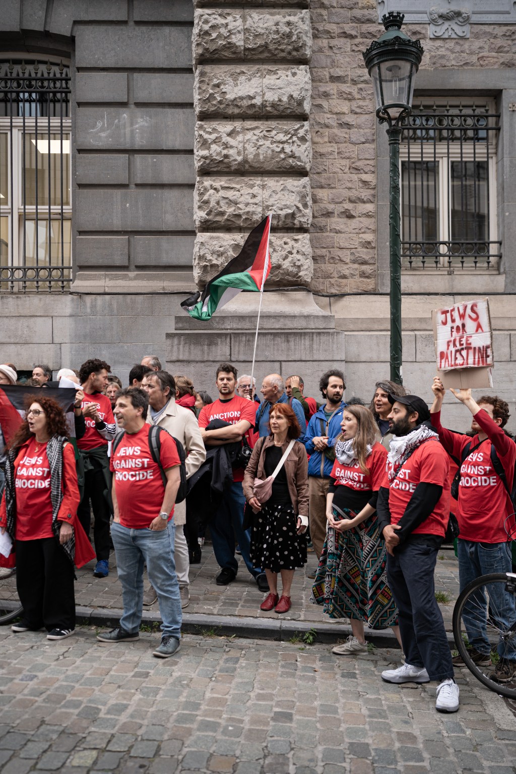 Vers 18h45, l’action a pris fin et une partie des manifestant·es du bloc juif a constitué un cortège sauvage dans les rues, du ministère jusque la Bourse, pour rejoindre le rassemblement pro-palestinien qui y a lieu quotidiennement à 19h.