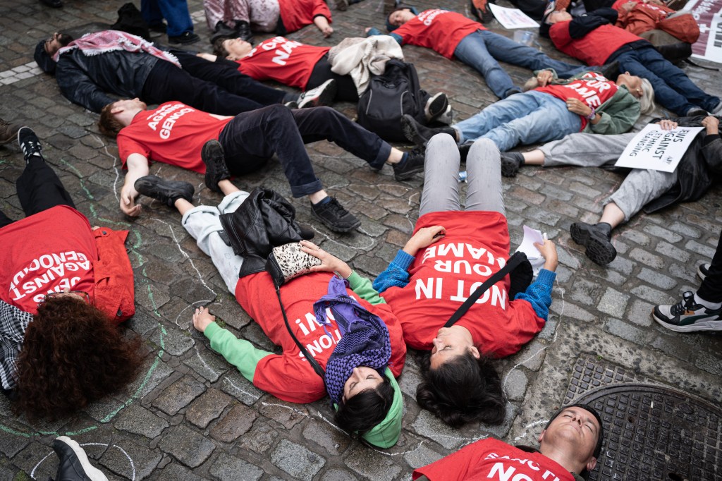 Après avoir scandé de nombreux slogans, les manifestant·es ont effectués un die-in. En simulant la mort en s’allongeant au sol, iels mettent en évidence les dizaines de milliers de victimes à Gaza.