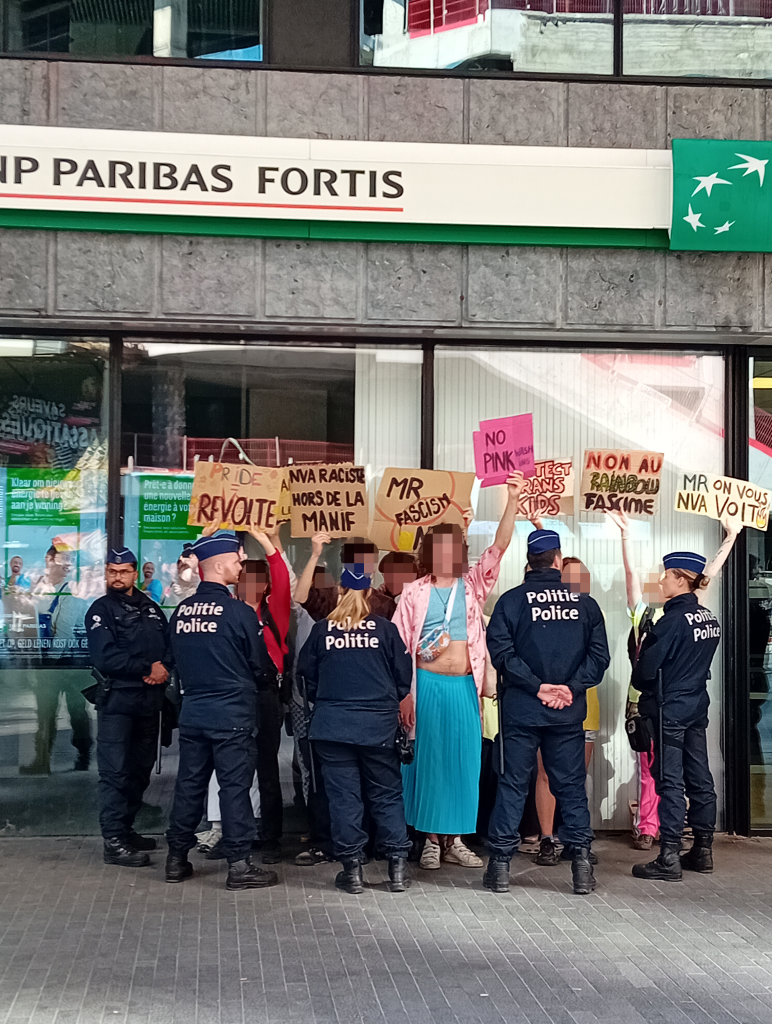 « [Les militant·es] estiment que la présence de partis politiques, tels que le MR et la NV-A constitue une insulte pour les communautés et les personnes qui souffrent directement de ces discriminations et des violences qu’elles engendrent. En 2024, 136 personnes LGBT ont été discriminées ou violentées en Belgique. Officiellement, car selon une étude européenne (2), en Belgique seules 14% des victimes portent plainte. Ces partis promeuvent des discours voire des lois contre les droits des personnes trans, les travailleur·euses du sexe, sans parler des personnes migrantes ou des allocataires sociaux, dénoncent les auteur·ices des actions. »