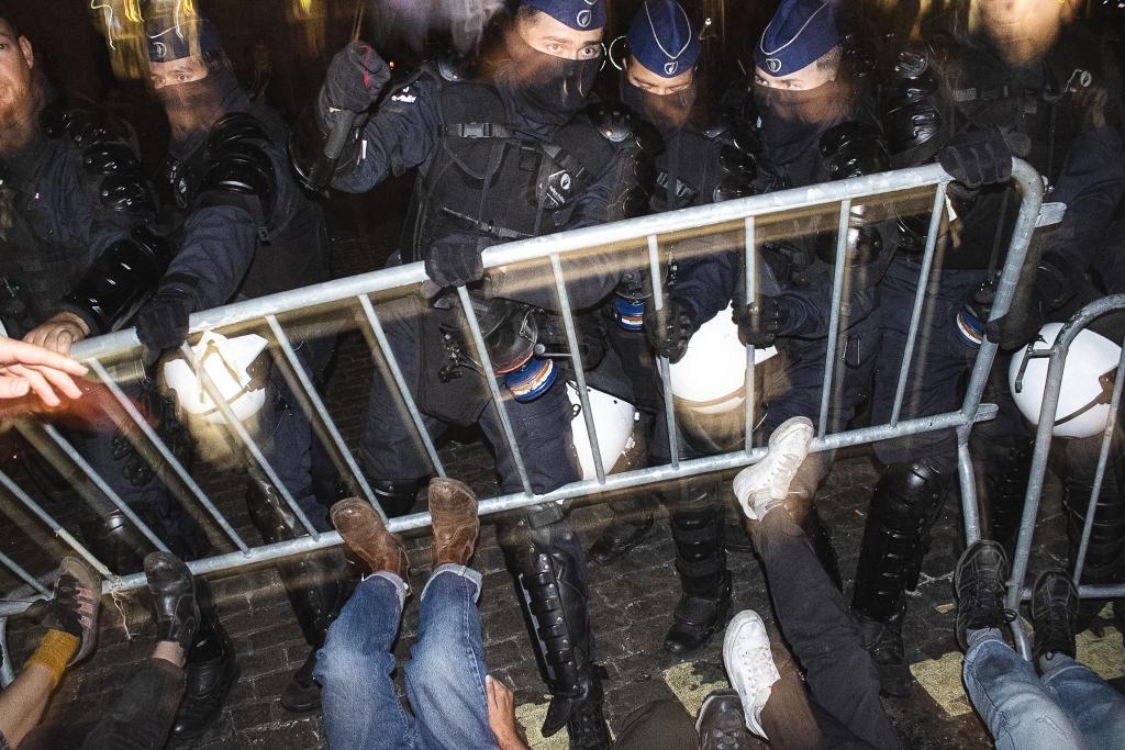 Une partie des manifestant·es a ensuite rejoint la place du Luxembourg, devant le Parlement européen, avec l’intention d’y rester toute la nuit dans un sit-in. Mais vers 22 h, les forces de l’ordre sont à nouveau intervenues avec une violence extrême: canons à eau, charges successives, matraques et gaz ont été utilisés pour déloger les manifestant·es.