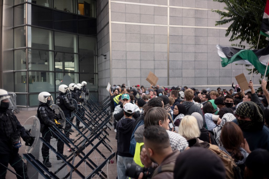 Après cette première séquence, plusieurs groupes se sont dispersés pour bloquer des axes stratégiques. Les carrefours de Louise et Porte de Namur ont ainsi été paralysés par des manifestant·es, avant que la police ne fasse usage de gaz lacrymogène pour les disperser. La manifestation s’est alors dirigée vers le centre. Un cortège d’environ 500 personnes a traversé les Monts des Arts pour rejoindre la Bourse, où un rassemblement quotidien pour la Palestine a lieu depuis plusieurs mois. Aux alentours de 20h30, près de 3 000 personnes occupaient la place de la Bourse.
