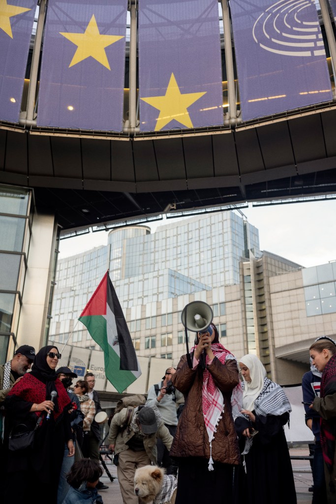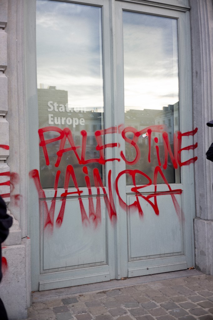 Le cortège a ensuite pris la direction du Parlement européen. Arrivé·es devant l’institution, les manifestant·es ont organisé un sit-in sur la Place du Luxembourg qui a duré environ 1h30, occupant symboliquement l’espace au cœur du quartier européen.