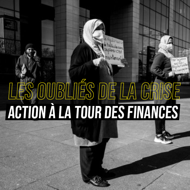 Complètement absent·e·s du débat public par rapport à la crise sanitaire, les sans-papiers n’en souffrent pas moins gravement. Ce lundi 20 avril, vers 11h, un groupe d’une soixantaine de sans papier s’est réuni, avec quelques dizaines de soutiens, pour réaliser une action éclair devant la tour des finances, où se situe le bureau de Maggie…