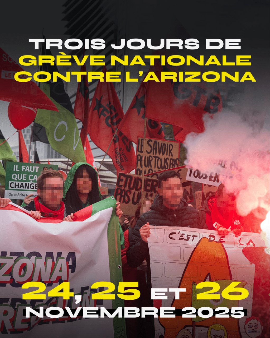 24, 25 ET 26 NOVEMBRE 2025 Les syndicats FGTB, CSC et CGSLB organisent trois journées de grève nationale contre les mesures antisociales du gouvernement Arizona (MR – N-VA – Engagés – CD&V – Vooruit). Cette mobilisation d’ampleur historique vise à faire reculer un gouvernement qui attaque systématiquement les droits des travailleur·ses et des personnes déjà…
